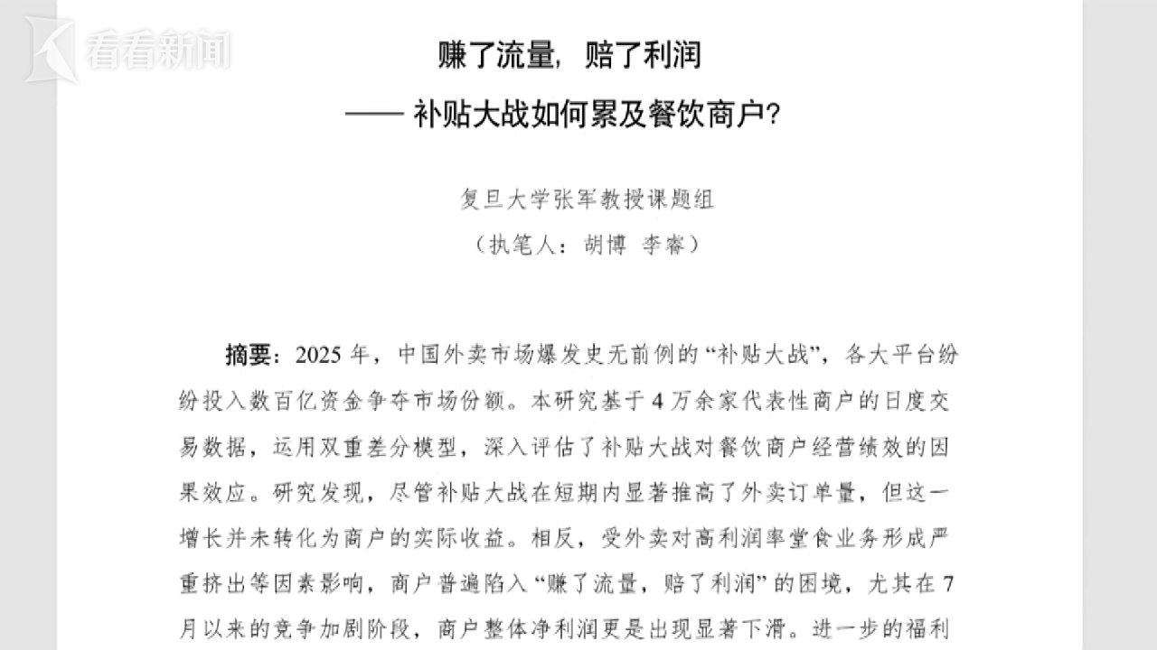 今年外卖行业的流行词是持续数月的“外卖大战”。近日,复旦大学经济学院院长张军教授团队发布了一份报告。通过大数据分析,其调整了参与今年平台“外卖大战”的小商户的最终“结果”,被记录为“获得了流量但损失了收入”。今年有多少小商贩从激烈的补贴战中逃脱?我手里拿着的是复旦大学经济学院张军教授课题组最近发布的一份研究报告。通过分析外卖平台上全国4万多家商户的堂食和外卖全渠道交易大数据,他们得出了一个重大结论:“增收不增收”对于小商户餐饮来说,是他们在这场战争中的惯常生存状态。数据显示,7月份以来,累计外卖和外卖订单平均增长了7%,但每日实际收入却下降了近4%。复旦大学经济学院院长张军教授表示:“理论上,大家可能会认为交易者疯狂获利。但实际上,随着订单量的增加,每笔订单的平均价格下降。交易者的总利润不会增加,利润实际上会减少。”七八月,正是补贴大战最激烈的阶段,我也采访了几家小店。肉眼可见,补贴实际上刺激了消费,给我带来了困扰。一位商人告诉我:“我工作了十多个小时,所以只喝水,没有时间吃饭。”对比去年和今年的外卖订单量,4月30日,在淘宝“闪购”升级并推出大额补贴计划的同时,美团也紧随其后,加大了金额,“补贴大战”一触即发。”热度升温,外卖订单量同时“飞扬”,7月5日后增速扩大。再看这张图。竞争加剧期间,外卖订单量增长了19.5%,但与此同时,外卖订单量却减少了近11%。也就是说,一些原本打算在店里花钱的顾客被外卖折扣吸引,改变了购买行为。根据测算,外卖订单量平均净利润率下降了近11%。堂食业务在10%左右,但外卖业务由于加上了包装费、平台费等,通常只有3.5%左右,这相当于高毛利业务减去低毛利业务,结果是商户更勤奋,但赚的钱却更少。看上去很忙,但赚不了多少钱。”另一位店主算了一笔账:“过去两年“一个月来,整体收入下降了30%左右。”在单价下跌和食品供应损失的双重影响下,4月30日之后,2025年餐饮商户的收入曲线,也就是图中蓝线,开始逐渐低于2024年。到了夏季,差距会进一步拉大,未来可能会产生影响。但也有商户担心,如果长期从事低价活动,还有一点你可能想不到的是,“补贴大战”导致堂食减少后,也产生了蝴蝶效应,影响到了美容院、卡拉OK等线下娱乐业态,原因也不难理解,如果点外卖,连门都不用走了。哦f咖啡20多元,但有了外卖补贴后,才几块钱。有什么问题吗?事情真的是这样吗? “短期来看,当我们得到补贴时,消费者肯定会高兴。但笑到最后还要看商家怎么做。”张军教授表示,“当商家的成本较高时,他们可以利用自己的成本智慧来生存。这意味着外卖食品和饮料的质量可以得到更明显的补贴。如果不参与,就没有流量,消费者可能不会寻找商家。一些商家无奈地说:“如果你拒绝这个活动,就会影响店里的客流量,给你带来麻烦。”这种情况损害了中小商户的合法权益,过度报告最后,研究团队向监管部门提出了两点建议:一是限制大额补贴上限,防止不合理价格。行政长官战争;同时,严禁将补贴成本转嫁给贸易商。张军教授强调:“我们并不是说不需要补贴,而是补贴要适度。比如引导消费者在非高峰时段下单,可以考虑这样的补贴。”轰轰烈烈的“补贴大战”持续了数月之久。哪个平台赢了?我从公开信息中找不到答案。另一方面,从近期各平台公布的财报来看,这场补贴战已导致“三巨头”烧毁近800亿元资金。美团季度亏损高达160亿元,阿里巴巴和京东的净利润也跌了一半。这是停止“补贴战”的信号吗?我不能肯定地说,但作为一名购物者,我预计街上会有一些较小的商店,它们不会经常提高价格,也不会偷工减料。剪辑:张宇阳 视频剪辑:刘义达 摄像:李慧杰 剪辑:李银涛 Copyright © 2024-2026 爆料网每日爆料黑料吃瓜-独家黑料爆料-51黑料爆料 版权所有