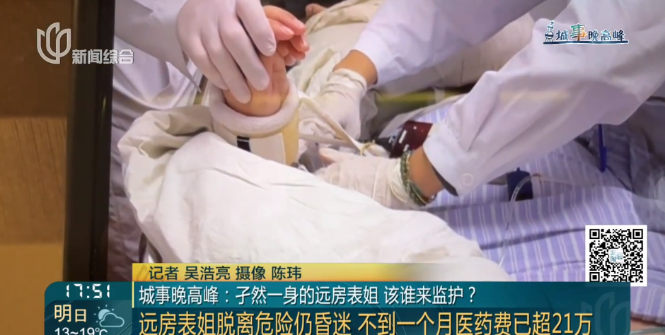 小芳多次关注过女士。江某,女,46岁,家住虹口区。他的父母早逝,他单身,没有孩子。今年10月,他突发脑溢血,被同事紧急送往医院救治。为解决后续医疗费用问题,蒋女士居委会介入。一方面,他向法院申请担任她的监护人。另一方面,他被任命为“临时监护人”,直至完成法律承认程序。 “以帮助江女士治疗为名,一切都在向好的方向发展。没想到,昨天(12月14日),江女士病情加重,去世了。看似好转,转入医院后病情却突然恶化。然而,江女士的远房表弟先生、女士周一从新华医院转院至嘉定南翔一家私立康复医院后,病情突然恶化。”n突然恶化。吴先生:我刚转院的时候,看上去情况还不错。然而,从周四和周五开始,我不断收到医院的通知,说我心脏骤停,需要复苏。经过一个小时的复苏,我被告知我正在好转。过了很长一段时间,不到几个小时,我又被告知需要复苏。当我周六赶到那里时,他的生命体征不太好,呼吸机也没有打开。邮电小区党支部书记王振军:我说要全方位对待他。您(医院)将提供您(医院)应使用的所有治疗计划。我希望你能救他。因为周六医生告诉我们,这可能非常危险,所以请了专家。他们将在周日早上对他的病情进行咨询,看看有哪些更好的治疗方案。吴先生说已经周六的专家会诊中,他再次垫付了1万元现金,但最终他的远房表弟还是没能活下来。吴先生的远房表弟:我说先垫一万块钱,但是康复医院说要钱,然后就冲出去了。三公里内没有银行。没想到周日上午九点左右,我接到了秘书的电话和信息。经过一个小时的抢救后,医院也宣布他死亡。邮电小区党支部书记王振军:周日,不幸的是,上午9点前,医院告诉我们,他心脏骤停8次,而且间隔时间越来越短。救援失败后,他的表弟不幸去世,搬家的决定受到质疑。最终,蒋女士未能接受专家会诊,于昨天上午10时45分去世。尽管悲伤,吴先生还是难免对之前的转会决定表示不满。新华医院提出的方案。吴先生。姜女士的远房表弟:我还有一个问题。三级医院新华医院的保险也联网了,医疗条件也不错。为什么要转去一家听不见名字的二级康复医院。关键是转院后会出现很多系列的并发症,都得救了,所以我不知道要不要转院。邮电小区党支部书记王振军:一开始先生也问过我。吴等人如何推荐康复医院。作为基层单位,居委会不知道哪家康复医院更适合。我把这个权利给了新华医院。我说根据你的专业意见和你接下来治疗的计划,哪家医院最合适?如果你推荐,我们会把他搬到那里。今天上午,记者尝试o 联系新华医院面谈,再次被拒绝。昨天晚上,记者来到嘉定区这家康复医院,看到张女士床边的墙上贴着治疗物品。蒋.资料显示,姜女士在该院接受了身体功能训练、理疗、针灸等康复治疗。不过,记者试图采访抢救情况也遭到院方拒绝。是否转院涉及多项医疗专业指标,与女士自身的身体状况有关。蒋.我们无法判断。但现在,吴先生和吴女士有了新的担忧。挚友蒋女士:蒋女士的遗事如何处理。姜女士的远房表弟吴先生:说到继承,用他的钱给他是有道理的。我说我们需要买一个墓地。王书记说不可能。最好为国家埋葬你米在海上。我说,那你让我们谈怎么谈,然后你就不能用自己的钱来处理结果了。我想任何一个对他来说是诗人的人都可能无法想象。吴先生和姜女士的朋友都希望为他们举办追悼会,并为他们购买一块墓地。蒋女士的朋友:我觉得他的死应该比较体面,至少开个追悼会,弄个墓地吧。如果这些都做不到的话,我想以后还会有很多单身人士。现在单身的人不多了。我觉得他们很孤独,花不了自己的钱。江女士的远房表弟吴先生:给他一个像样的或者有点像样的告别,跟同事们,包括社会报道后很多关心他的人,总有一个交代。对此,虹口区民政部门表示,根据《上海市殡葬管理条例》规定,葬礼通常由死者的近亲属主持。像蒋女士这样的恶人,如果吴先生愿意办丧事,可以提出书面申请,但购买墓地的费用必须在合理范围内,后续的维护费用仍需由吴先生承担。虹口区民政局社会科科长叶玉倩:他提到的一些殡葬或者墓地的要求是可以满足的,可以从女士的遗产中支付。蒋.不过,墓地可能包括每年的维护费用和其他费用,吴先生对此表示。民政部门作为物权法的管理者,也面临一些现实困难。上海申道律师事务所首席律师杨邹华:比如说,如果他要为他举办追悼会,什么标准才符合规定?最终可以得到遗产受托人的认可,支出可以通过女士自己的遗产来支付。蒋.事实上,这个标准还没有出台发达。有了这样的墓地,其实我们也知道墓地的价格从高到低会有很大的差别。另外,今后每年还会有一些墓地的维护和保养的相关费用。最初的购买价格,以什么标准才能得到遗产管理者的批准。另外,以后这个墓地的维护费用如何花去,确实是以后的一个很大的困难,所以他们需要一些相关的法律细节来最终完善整个系统。虹口区民政部门表示,像姜女士这样的事件还是第一次发生。什么样的支出属于合理范围,还需要法院审理后确定。民政部门作为财产管理人,将按照法院制定的标准执行。另外,本案中,在阅读了民法典的相关规定后,实施细节上仍存在差距。例如,江女士需要钱,而他却昏迷不醒,无法使用这笔钱。然而,法院通常需要几个月的时间才能确定居委会是监护人。这个真空期成了一个大问题。对此,虹